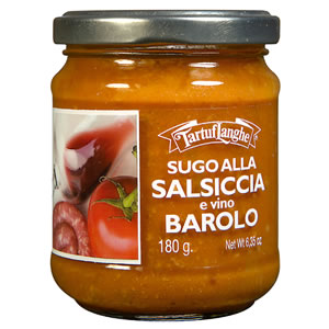 Sausage from Piemonte 36%, Barolo wine D.O.C.G.5%, Tropea red onions tomato pulp, extra virgin olive oil. Tasty sauce, ideal to dress all kinds of fresh and dry pasta, gnocchi, ravioli, tortelli