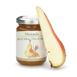 Pere "Williams Christ" (63%), zucchero, succo d' arancia, pepe rosa, peperoncino, zafferano (0,1%), spezie. Fresca combinazione di amabile pera e pregiato zafferano. Perfetta con il formaggio fresco, soprattutto pecorino, nonché contorno ideale per la vostra fonduta di formaggio.