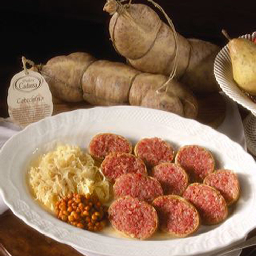 According to tradition, the Cotechino is usually produced in winter using the prize meat of the anterior shin of a large pig and the lard of its leg. The meat is coarsely minced, flavoured, wrapped and dried for ten days. In order to avoid the Cotechino meat becoming too dark during cooking, a small amount of nitrates is added. Cotechino is a type of pork meat cured in a similar way to Zampone, but the difference is the external wrapping: the Cotechino “sack” is made from a better quality of leg rind. Cotechino, the recipe for which has been around for longer than that of Zampone, was created to make use of poor cured meat. It was usually served with vegetable soup or minestrone and lentils. The first recorded mention of Cotechino dates back to 1745: its cost and recipe appears in a “price control” in 1746. The Cotechino became synonymous with its current noble position in 1910, when the famous Pellegrino Artusi nominated “Cotechino Fasciato" as recipe number 322 in his famous book "La scienza in cucina e l'arte di mangiar bene" (“Science in the Kitchen and the Art of Eating Well”). To fully taste its flavour, the Cotechino must be boiled in unsalted water for 3 hours, the water must be cold at the beginning and become simmering to properly cook the meat. Before proceeding with cooking it is recommended to punch the Cotechino rind with a stick and wrap it in a dishcloth or in tin-foil.