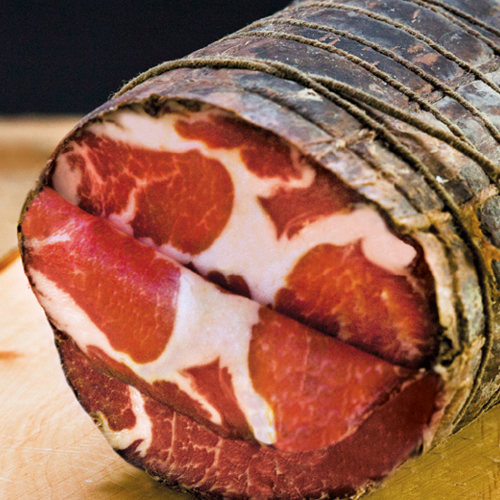 Coppa al Sangiovese is made of Italian pork meat that is aged at least 4 months and then marinated in tanks of wine must and Sangiovese for at least 30 days.