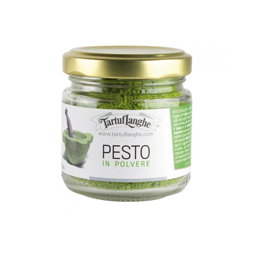 Pesto powder: a new texture for the most typical italian sauce that maintains the original flavour of the fresh pesto genovese. An innovative technique that does not imply cooking, preserves the original characteristics of fresh basil and other ingredients. A condiment that is versatile and can at the same time enrich a simple preparation as well as transform in a refined and elegant way a caprese salad, pastas, pizzas, fish courses, mozzarellas and burratas.