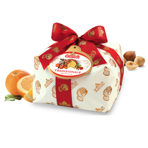 Low Piedmontese Panettone, rich in butter, eggs, raisins and candied fruit. Coated by a delicate almond icing.