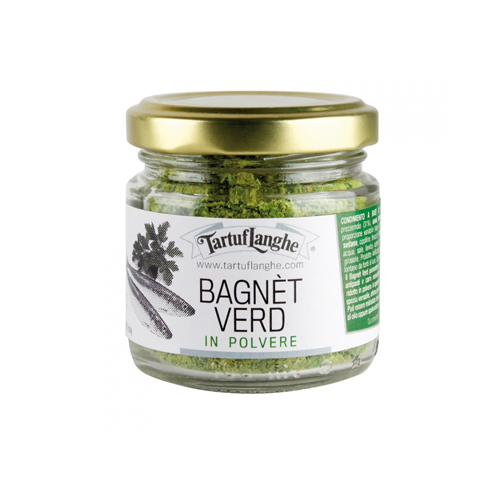 Parsley, anchovies, tuna fish, eggs and garlic. The most classic condiment from Piedmont, the Bagnét Verd is reinvented in this new version and reduced to powder without any additive or preservative. Used as a spice adds a twist of taste to all recipes and enhances the flavour on meat as well as it gives a spark of freshness on vegetables and fishes. Perfect on raw fish, octopus or all kind of boiled meat.
