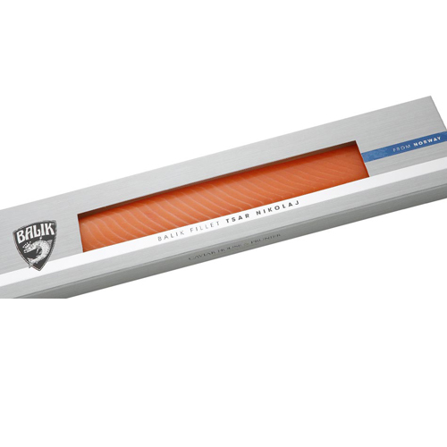Careful preparation of the exquisite salmon fillet acknowledged as a culinary masterpiece as far back as 1984 is reviving a tradition from the Court of the Russian Tsars. For special occasions only the very best will do. The entire side of salmon is lightly smoked using the Balik method. Thorough trimming makes every gram of Balik Fillet Tsar Nikolaj an indulgence! To prepare for serving, cut the Tsar Nikolaj fillet vertically into approximately 1 cm thick medallions. This provides delicious petals of salmon, which can be beautifully decorated and taste out of this world.