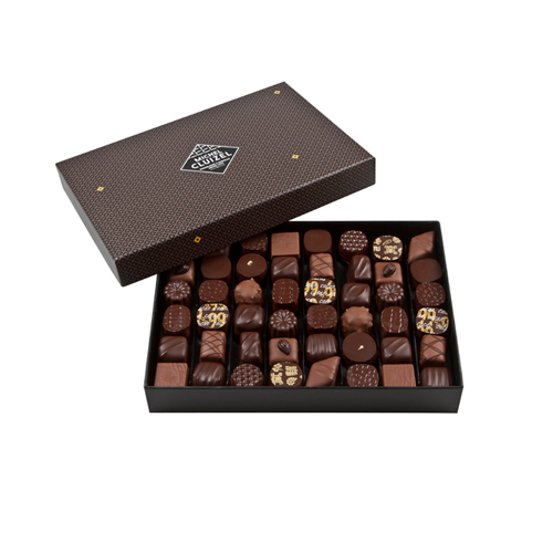 Praliné amandes et noisettes aramélisées au grué de cacao.